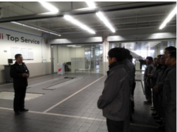 该一汽大众特约4s店拥有一流的维修设备:举升机、专用工具车、轮胎动平衡机、四轮定位仪、大梁校正仪、烤漆房等,同时还拥有先进的大众品牌专用进口检测仪器。宽敞、整洁的业务接待大厅和服务周到的客户休息室为客户提供舒适的环境,也为我们示范了汽车营销与服务接待的业务流程。售后一楼宽敞的机电维修车间,设置20多个标准工位充分满足维修作业的需要。二楼配置齐全,分工细致的钣金喷漆工位,保证钣喷工作有条不紊地进行,也很好地为我们的参观学习提供了便利的条件。我们一行19人实行“一带一”模式,即一名师傅带一名学员,全程跟踪学习,两日一“机修”与“钣喷”岗位一轮换。让我们不再是走马观花,而是深入观察一名汽修师傅的日常工作内容,全面学习维修技,这对我们今后为学生做专业就业讲解、就业指导和上实训课程都具有很强地指导意义。